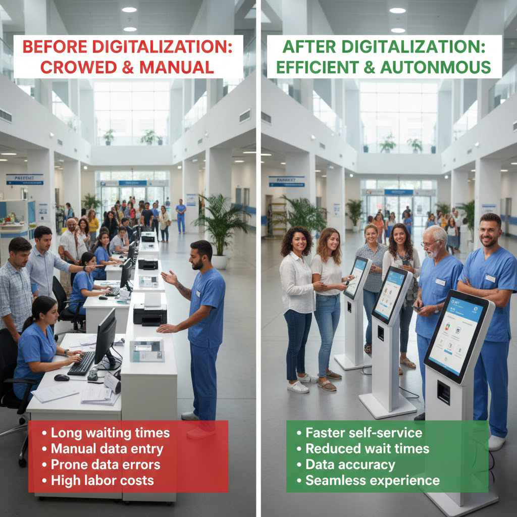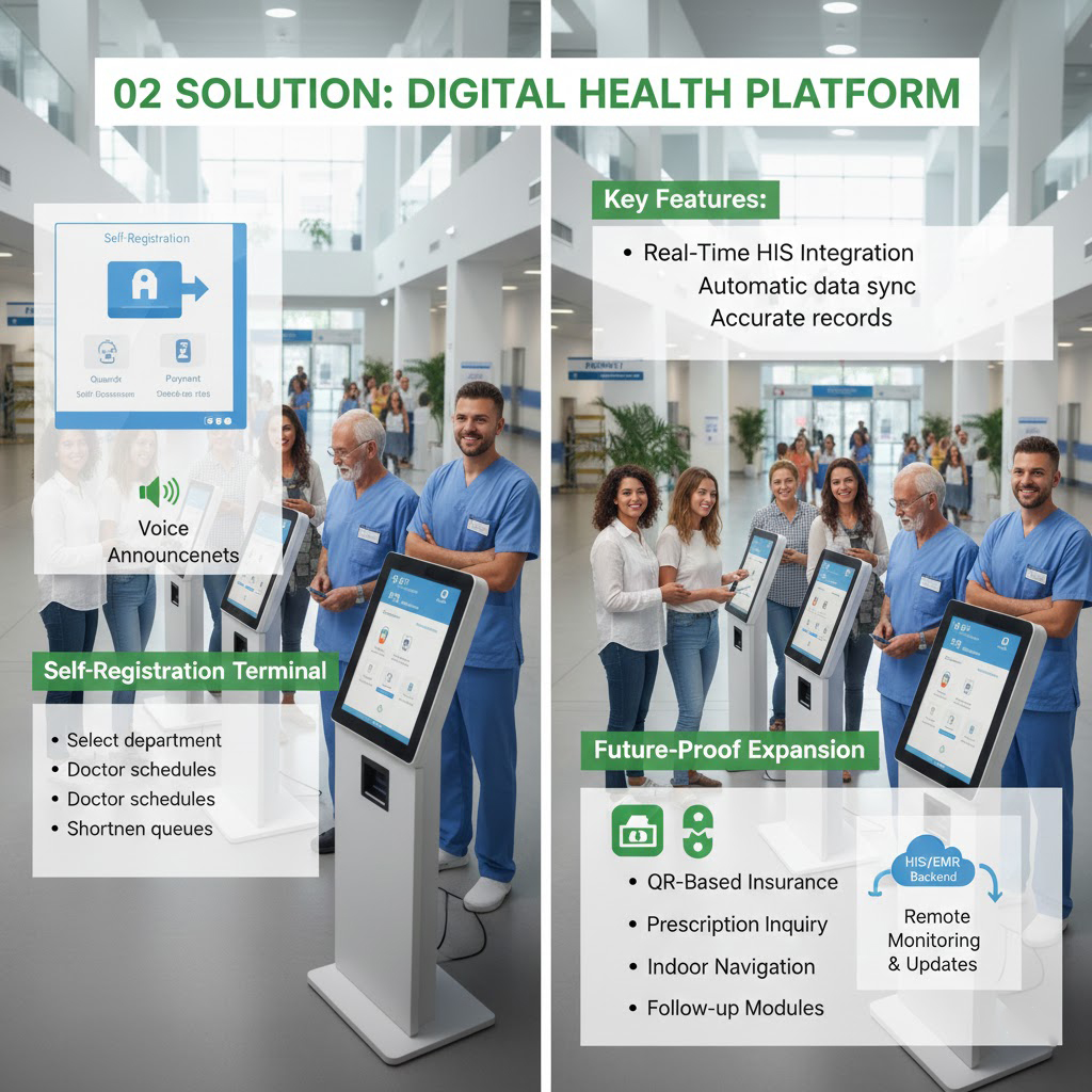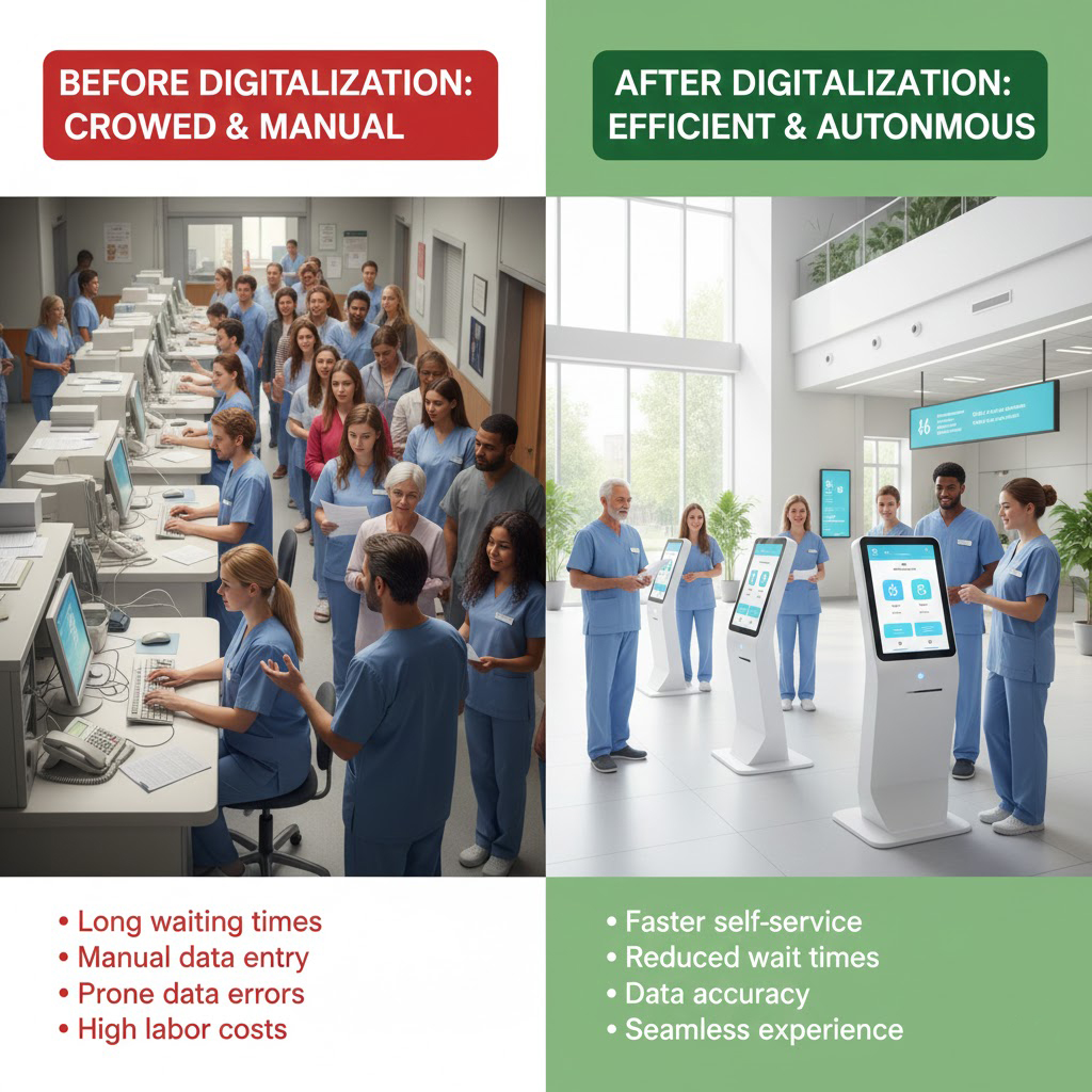 As healthcare institutions adopt more advanced digital systems, improving the patient-facing experience has become a central focus. Although backend platforms such as HIS, LIS, and EMR continue to evolve, many hospitals still rely heavily on manual processes at the registration window. This leads to several challenges: