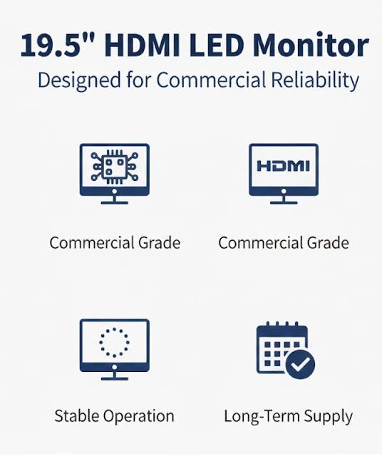 This 19.5-inch HDMI LED monitor is designed with commercial reliability in mind, making it suitable for control rooms, monitoring systems, and industrial workstations that require stable long-term operation. The screen size balances clear visibility with space efficiency, allowing it to fit easily into multi-screen setups or embedded environments. Its clean, professional appearance integrates well into technical and business settings. Consistent image performance supports continuous monitoring tasks and helps reduce visual fatigue during extended use. Standard interface design simplifies system connection and deployment. For project-based procurement or channel distribution, it offers a practical and versatile display solution with lasting application value.