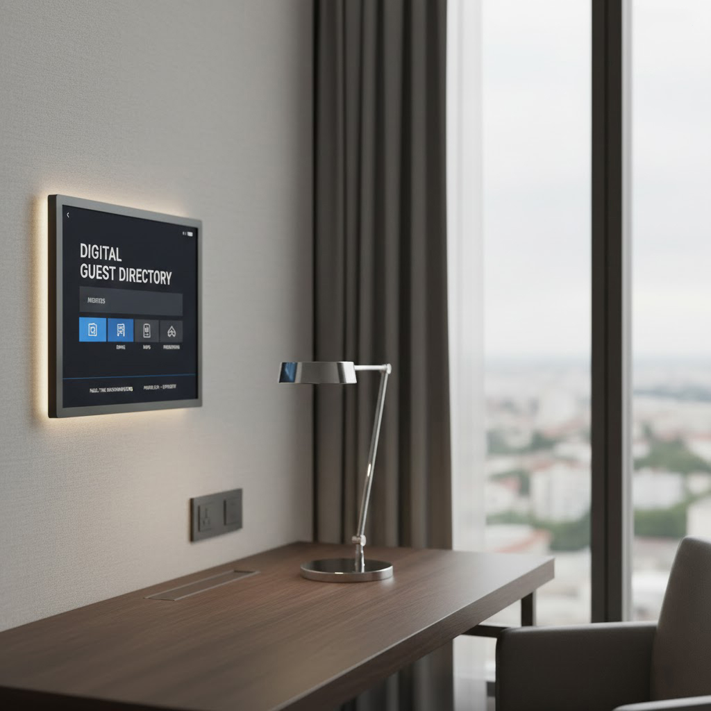 Printed directories and brochures quickly become outdated and require constant replacement. Hotels now rely on a digital guest directory tablet that displays real-time updates—whether for facility hours, maps, local attractions, or property announcements. With an interface similar to a tablet-based guest information system, guests can navigate the hotel more easily. Properties with extensive amenities use an interactive hotel room display to reduce reliance on front desk assistance and offer a cleaner, more modern in-room environment.