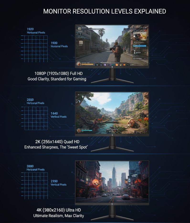 1080p, 2K, and 4K are the mainstream levels. Higher resolutions offer sharper images and improved clarity, especially for productivity tasks.