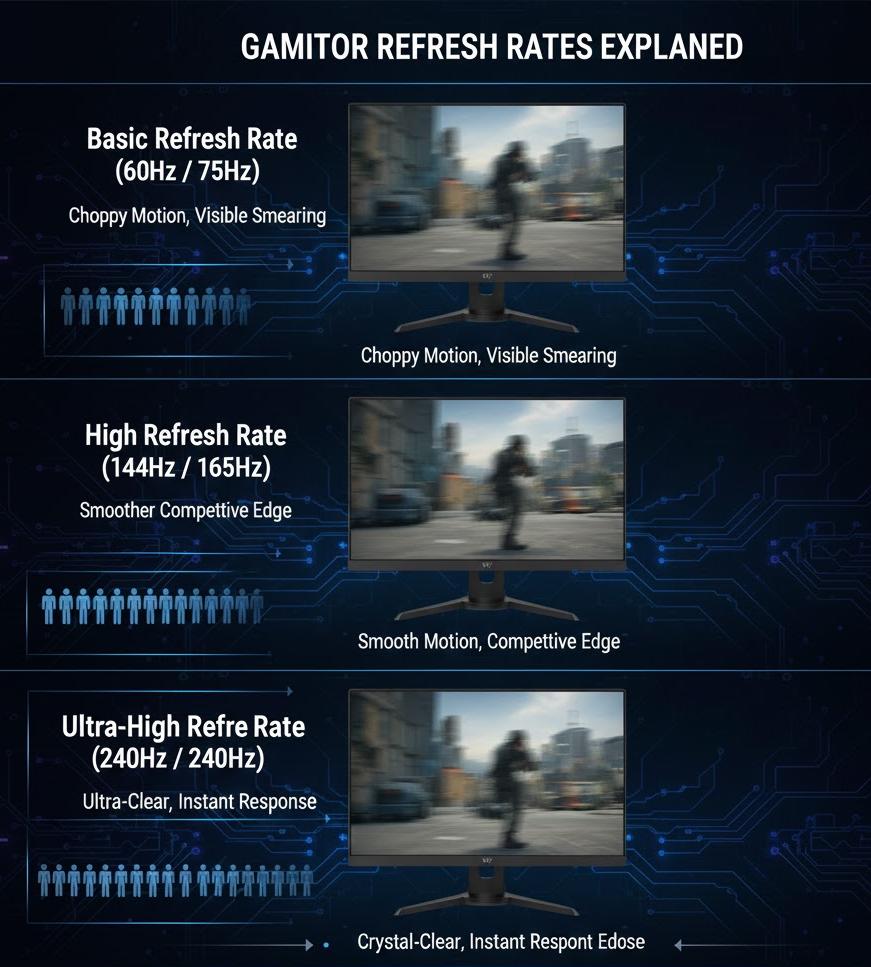 From basic 60Hz and 75Hz to high-refresh options such as 144Hz, 165Hz, 170Hz, 180Hz, and 240Hz. Gamers, especially FPS players, benefit significantly from higher refresh rates.