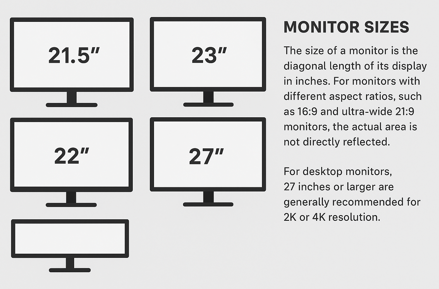 The size of the display is actually the diagonal length of its display part, in inches (1 inch = 2.54cm). In the case of the same aspect ratio, the actual area is in a square ratio to the diagonal length. For monitors with different aspect ratios, such as 16:9 and ultra-wide 21:9 monitors, the size comparison does not directly reflect the size of the two screens. You only need to know that under the same “size”, the closer the screen is to a square, the actual display area will be larger. Just bigger.