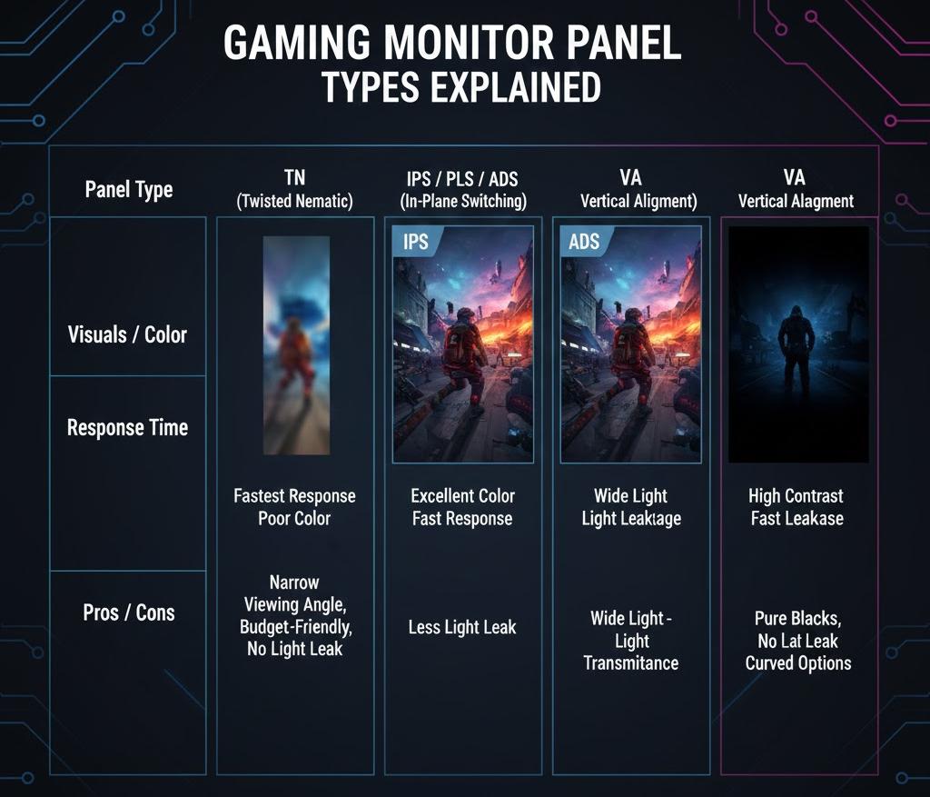 The display panel type refers to the underlying technology used in the screen, such as TN, IPS, VA, ADS, and PLS. Each panel has its own strengths and visual characteristics. In terms of image quality, ADS, IPS, and PLS panels deliver similar and consistently strong performance, offering wide viewing angles and accurate colors. VA panels generally provide better contrast but slower response times, while TN panels have the fastest response speed but offer lower color accuracy and narrower viewing angles. Overall, TN panels deliver the weakest visual experience compared with VA and other advanced panel types.