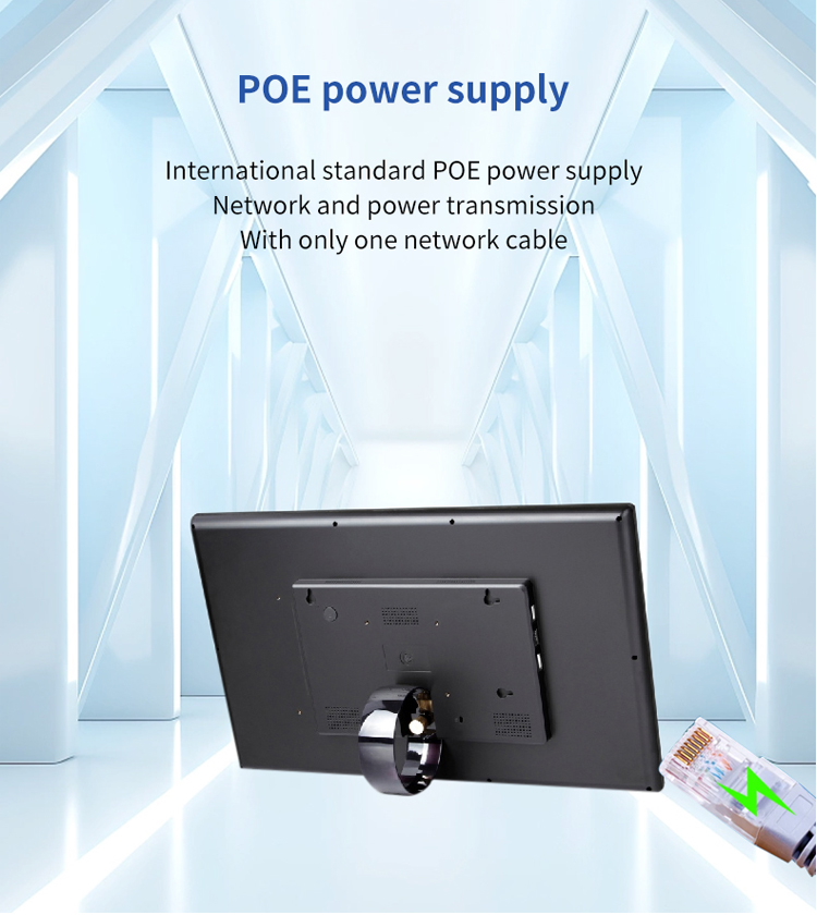 Yes The tablet supports POE enabling both power and data transmission through a single Ethernet cable. This reduces wiring complexity and is ideal for meeting room systems digital signage hotel door panels and corporate building applications.
