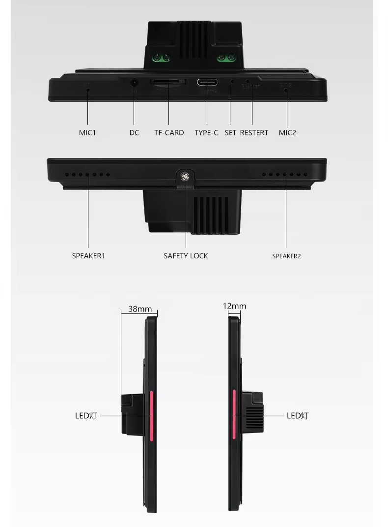 The tablet provides standard commercial interfaces required for smart home and building automation integration. These support power supply, network connectivity, and peripheral expansion, enabling seamless integration with lighting systems, HVAC controllers, access control platforms, and third-party smart home gateways.